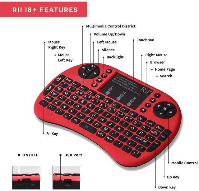 Rii's i8+ is the premier mini keyboard on the market. The keyboard includes a touchpad DPI adjustable functions and built-in high sensitive smart touchpad with 360-degree flip design. With a new classic look, the Rii Mini i8+ new increased LED backlit function can be used with LED lighting Qwerty keyboard with multimedia control keys and PC gaming control keys.