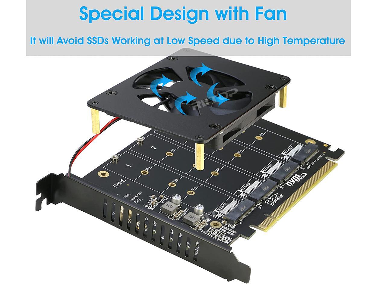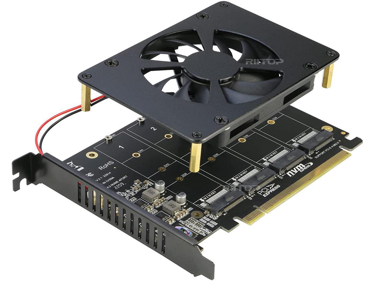 Quad NVMe PCIe Adapter, RIITOP 4 Port M.2 NVMe SSD to PCI-e 4.0/3.0 x16 Card with Fan for 2230/2242/2260/2280 SSD (PCI-e Bifurcation Required)