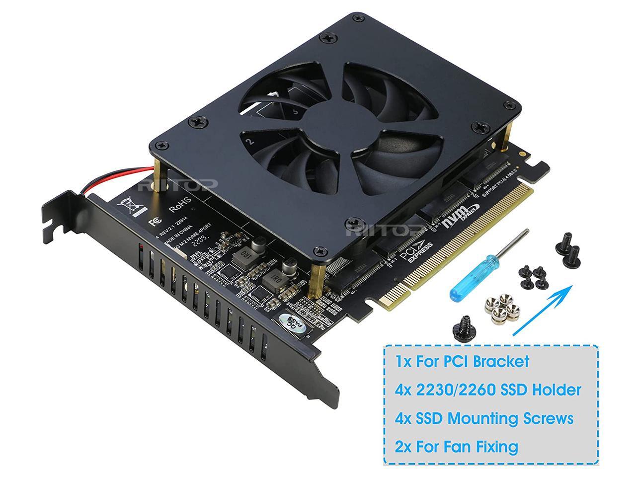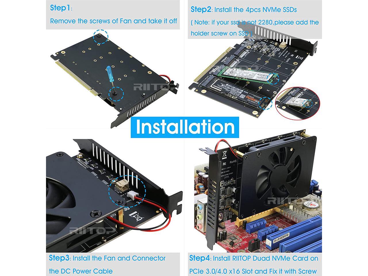 - RIITOP Quad NVMe PCIe Adapter allows you add 4x NVMe SSDs simultaneously via 1x PCI-e 4.0 or 3.0 x16 Slot on MOBO which supports PCI-e PCIe x16 Bifurcation. Full-speed transmission up to 4x 32Gbps