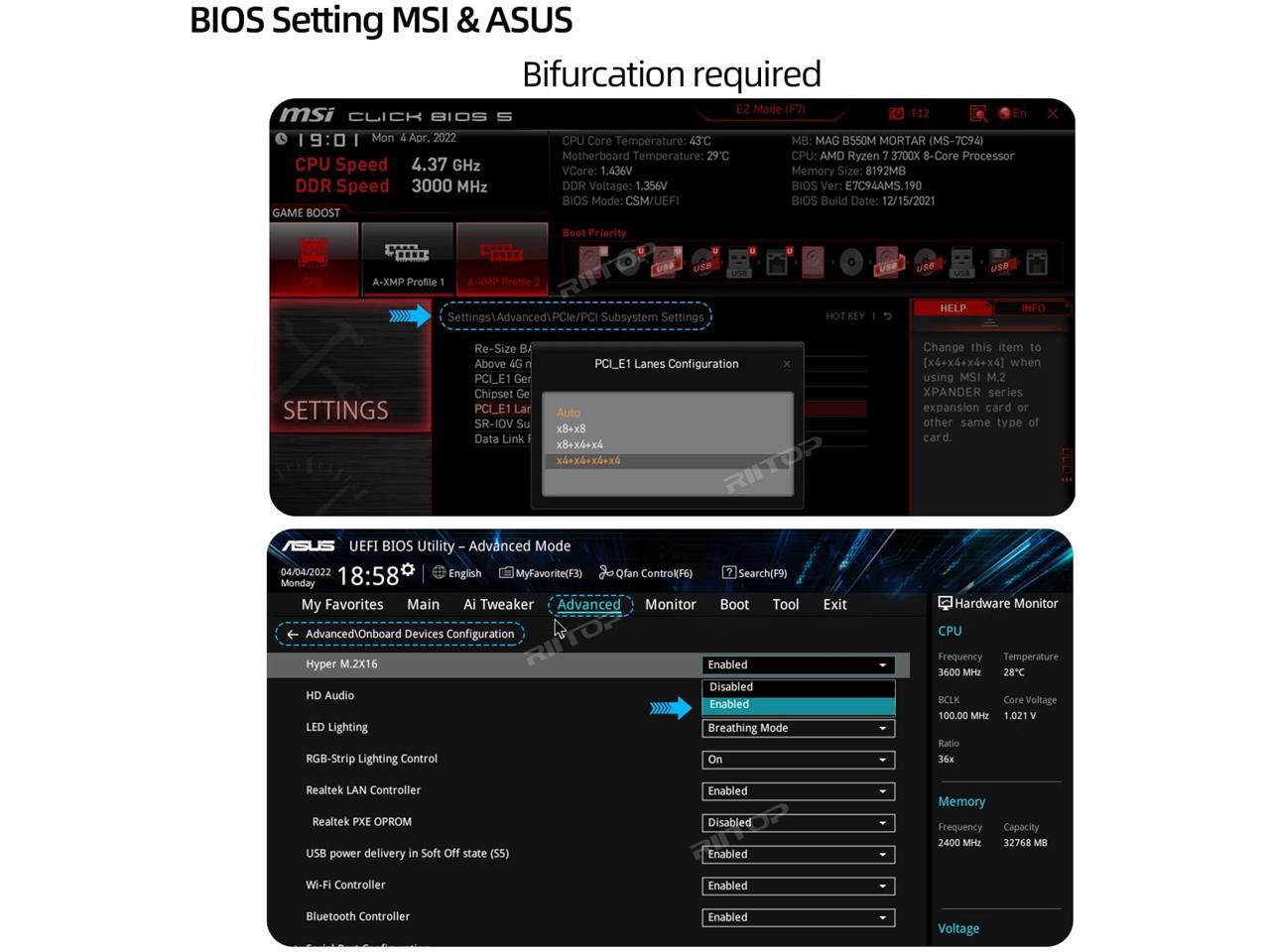 - Hardware requirement: 1. There is available PCI-e 4.0 or 3.0 x16 Slot on Mobo 2. The motherboard can support PCIe x16 Bifurcation itself 3. All of the SSDs are M.2 (M Key) NVMe SSD