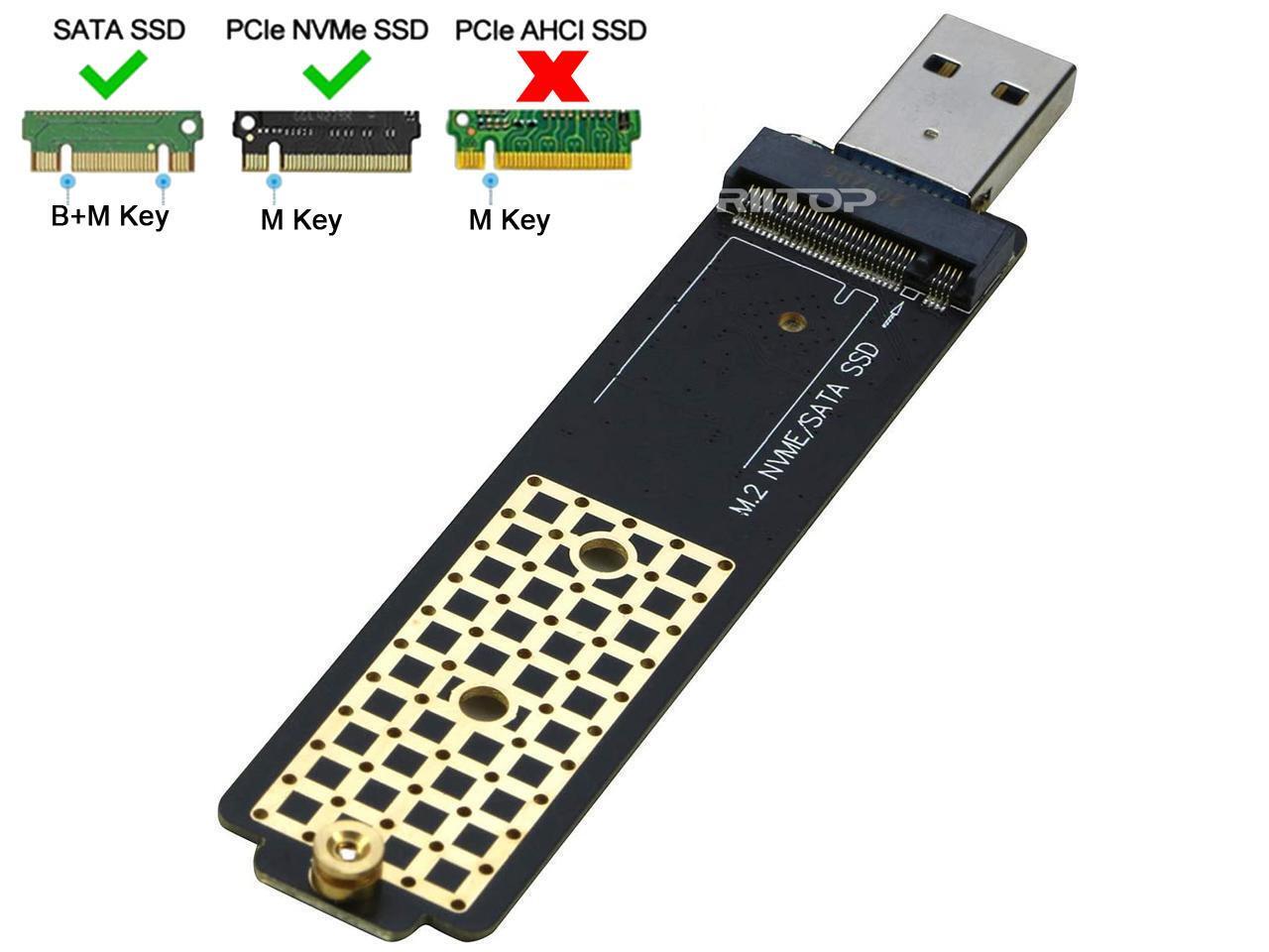 - M.2 to USB Adapter, RIITOP M2 SSD to USB 3.0 Card Reader Compatible with Both NVMe (PCI-e Channel) & B+M Key (SATA Channel) SSD,allows adding NVMe or B+M Key M.2 SSD to your PC via USB 3.1 3.0 Type-A Port at perfect performance