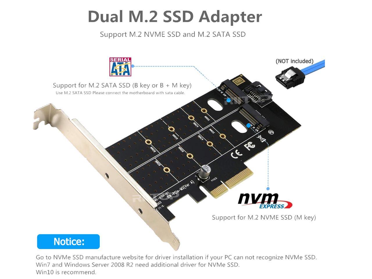 - RIITOP PCI-e 3.0 4x to NVMe M Key & SATA to NGFF (B Key) SATA-Based SSD Dual Port M2 expansion Card allows you add M.2 NVMe SSD & M.2 SATA SSD to motherboard without M.2 slot at the same time