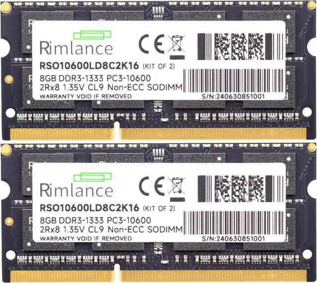 Rimlance 16GB (2X8GB) 1.35V DDR3 1333MHz PC3-10600 SODIMM 2RX8 Laptop Memory is a high-performance memory module designed to boost your laptop's multitasking capabilities and overall performance. With a total capacity of 16GB (2 x 8GB), this DDR3 SODIMM memory kit operates at a speed of 1333MHz, providing lightning-fast data transfer rates and seamless multitasking. Compatible with laptops and notebooks that support DDR3 SODIMM memory, this memory upgrade can breathe new life into your aging system, allowing you to run multiple applications simultaneously without experiencing lag or slowdowns. The 1.35V low voltage design ensures efficient power consumption, prolonging your laptop's battery life.