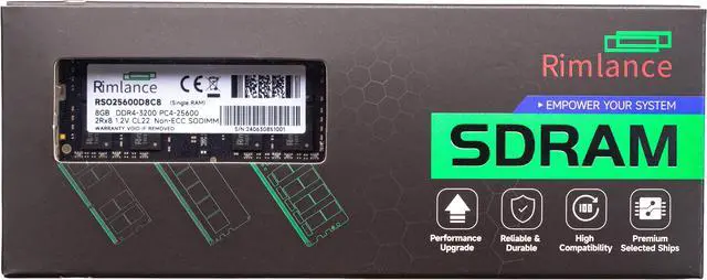 Upgrade your laptop's performance with the Rimlance 8GB (1X8GB) 1.2V DDR4 3200MHZ PC4-25600 SODIMM 2RX8 Laptop Memory. This high-speed memory module is designed to boost your system's multitasking capabilities, allowing you to run multiple applications simultaneously without experiencing lag or slowdowns. With a data transfer rate of 3200MHz (PC4-25600), this SODIMM module ensures lightning-fast data processing, making it ideal for demanding tasks such as video editing, 3D rendering, and gaming. Featuring a compact and sleek design, this 1.2V DDR4 memory module is easy to install and compatible with most modern laptops.