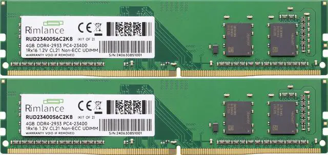 Rimlance's 8GB (2X4GB) 1.2V DDR4 2933MHz PC4-23400 UDIMM 1RX16 Desktop Memory is designed to enhance your computer's performance and multitasking capabilities. This dual-channel memory kit features two 4GB unbuffered non-ECC DDR4 DIMM modules, allowing you to upgrade your system with 8GB of high-speed RAM. Operating at a blazing-fast 2933MHz frequency with a low 1.2V voltage, this memory provides efficient and reliable performance for demanding applications, gaming, and multitasking. Compatible with most modern desktop motherboards supporting DDR4 UDIMM memory, this kit is an easy and cost-effective way to boost your system's memory capacity and speed.