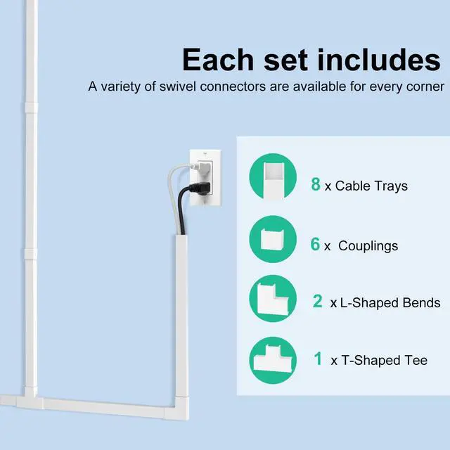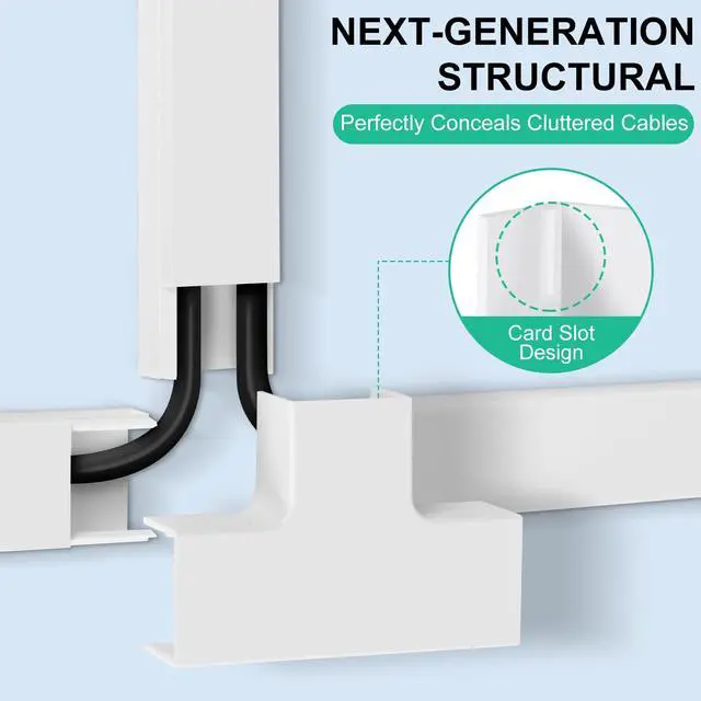 Value Pack: Each cable hider kit includes 8 white cord hiders, 6 straight connectors, 2 L-shaped bends, and 1 T-shaped connector. Each wall-mounted cable cover accommodates 3-4 cables, measuring 14.2 inches × 0.94 inches × 0.55 inches, with a total length of 113.6 inches.