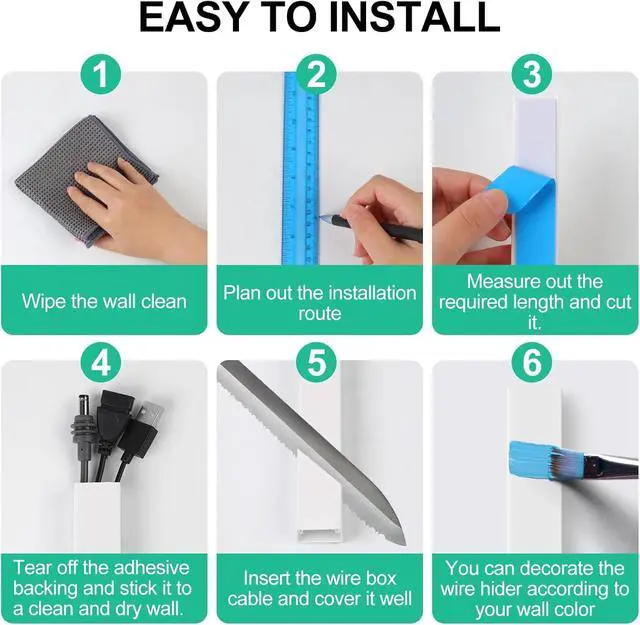 Easy and Quick to Install: Our cord hider requires no professional installation and can be easily mounted within minutes. Begin by mapping out the desired installation path, then securely attach the adhesive backing to the wall surface. Finally, insert the cables into the cord organizer and close the lid. With the Rindion's wall cord hider, your living room will achieve a sleek, clutter-free appearance.