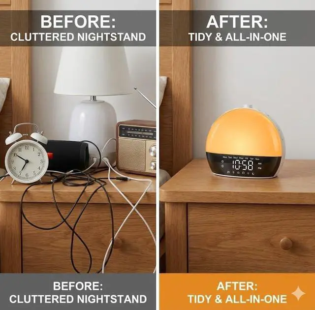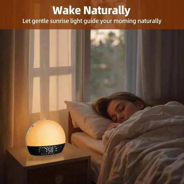 This sunrise alarm clock simulates a natural sunrise by gradually increasing light intensity over a 0-60 minute period, gently waking you from sleep. With customizable brightness settings and soothing nature sounds, it creates a peaceful wake-up experience. The sleek design features an easy-to-read display and 2 alarm clocks, making it perfect for both heavy sleepers and light risers. The ultimate goal is to start your day feeling refreshed and energized, mimicking the soft glow of a real sunrise.
