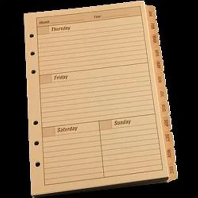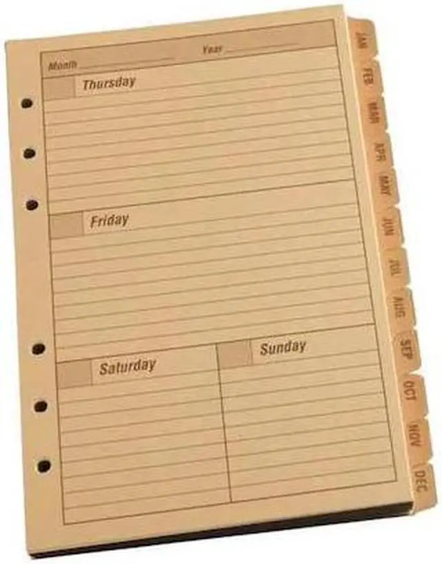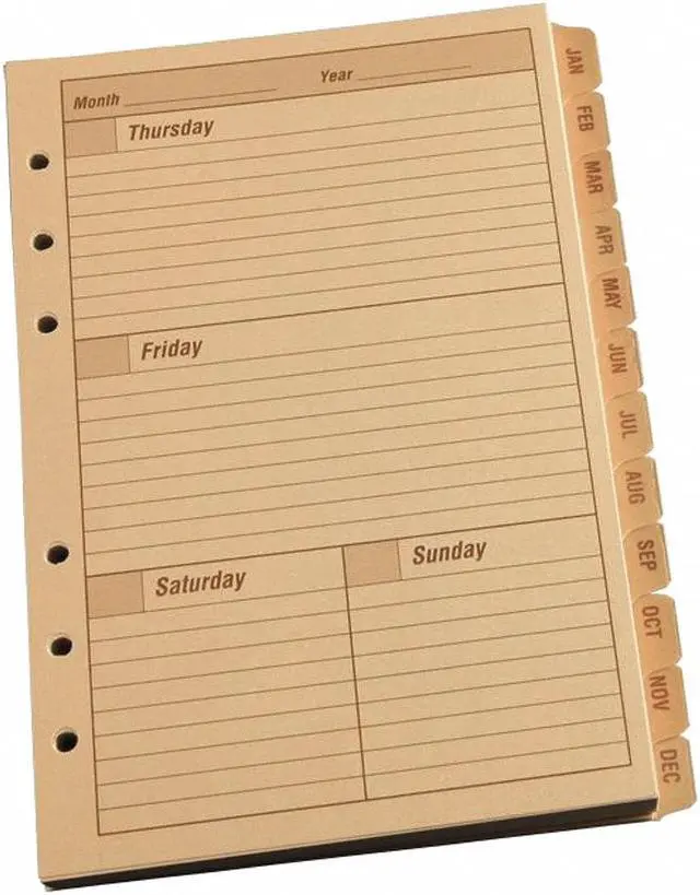Planner Refill Pages, Weekly, Sheet Size 5 in x 7 in, Format One Week Per Two-Page Spread, Color Tan, Includes 12 Monthly Tabs, 4 Year Overview, And A 4 Year Future Planner, Weekly Calendar Pages (52 Weeks), Features Weekly Calendar (1 Year), (12) Monthly Tabs, Future Planner (4 Years), Overview (4 Years). This item has been restricted from sale in the following state (s): []