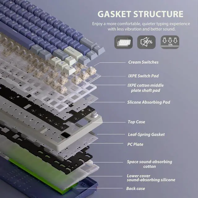 Improve typing feel, reduce noise and vibration, provide soft touch and premium sound experience.