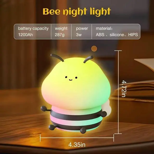 Special DesignThe unique animal bee design made the night light is so cute.Touch Control design made It is not only a practical bedside animal light, but also a cute decorative light, squeeze or tap the bee lamp body to change the brightness level of warm white light mode or cycle through 7 different colors.
