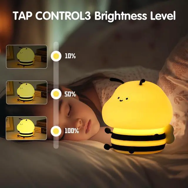 7 Colors with DimmingBee nightlight is in 3 level brightness warm white &7 color-changing mode. Push the bottom button to turn the bee lamp ON/OFF. Tapping/squeezing the light to change color. The light is gentle and soft, Created a soothing ambiance, ideal for bedtime or a relaxing atmosphere. Its touch sensor switch makes the baby night light ideal for late-night baby feedings.