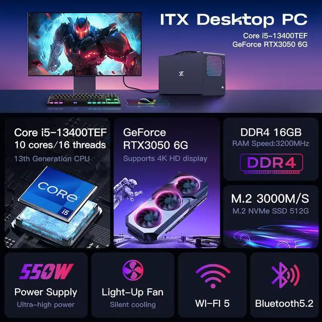 ITX P14 PRO is powered by Intel Core i5 14400F prebuilt gaming pc mini itx desktop powered by the GeForce RTX 4070 12G Blackwell architecture,enables game-changing Al capabilities in the latest games and apps.Multiply performance with DLSS 4,enjoy realistic graphics with ray tracing Processor Intel Core i5-14400F Processor (10 cores, 16 threads, turbo frequency 5.3 GHz) Onda 16G DDR4 Dual Channel SSD Kingston/Philips M.2 1T High-Speed Protocol Solid State Drive GPU GEFORCE RTX 4070 12GB GDDR6 PSU 550W All-aluminum chassis computer tower