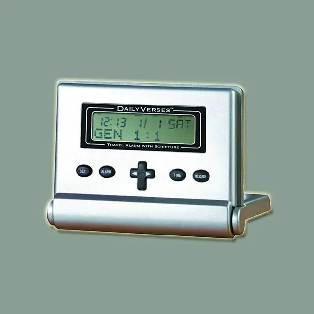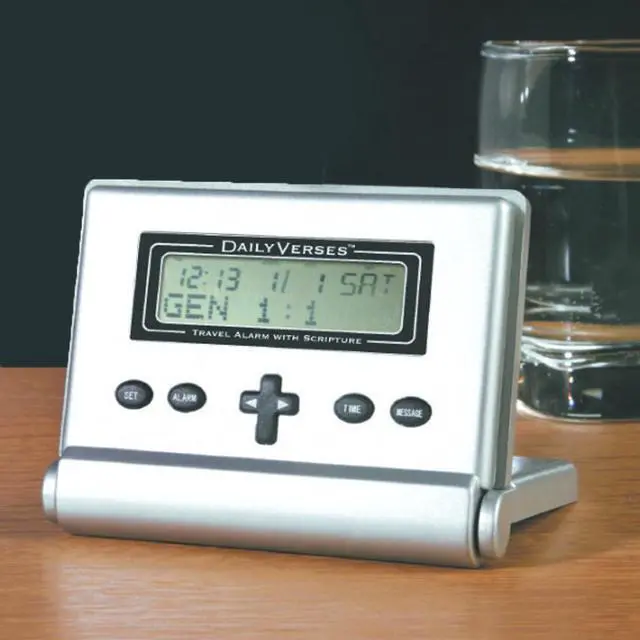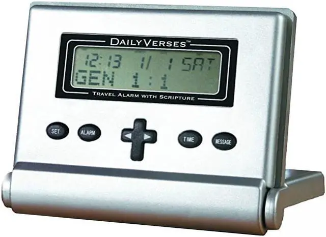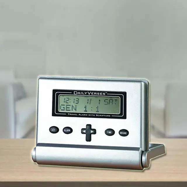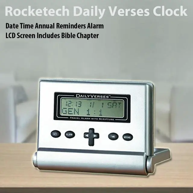 Rocketech - Daily Verses Travel Alarm Clock- Rise and shine each day with a scripture from the Bible! The compact Daily Verses alarm clock folds neatly for travel, with a protective lid that safeguards the function buttons in your pocket, briefcase, or suitcase. The lid also doubles as a stand for easy use. Packed with features, it includes a 100-year calendar, time display, and annual reminders. Perfect for prayer groups, teaching, or personal inspiration, this clock will inspire you every morning. Wake up to one of over 365 scriptures, and start your day with an uplifting message by simply pressing the cross-shaped button after turning off the alarm.