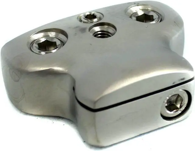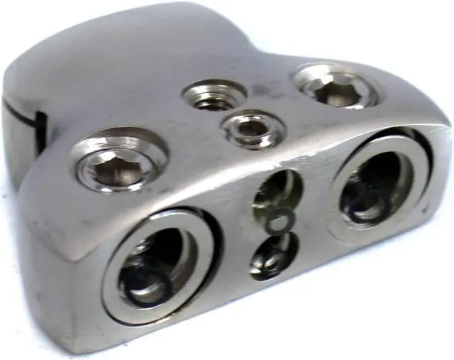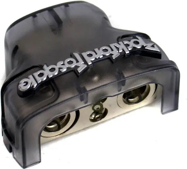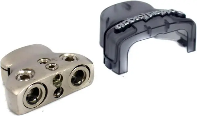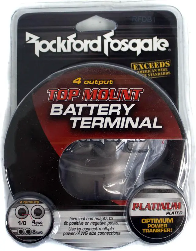 The ROCKFORD FOSGATE **RFDB1** is a quality made 1/0 or 4-Gauge Positive-Negative Car Audio Battery Terminal features Platinum plated battery terminals allowing for both a positive or negative connection utilizing the supplied sizing ring. The terminals of the **RFDB1** allow for multiple wire size inputs. Positive/Negative battery terminal, platinum finish. (2) 1/0 AWG/4 AWG input (2) 8 AWG inputs. The Rockford Fosgate cables exceeds American wire gauge standards.