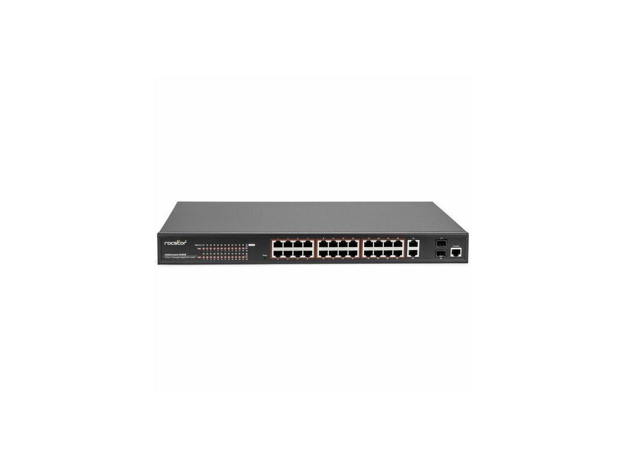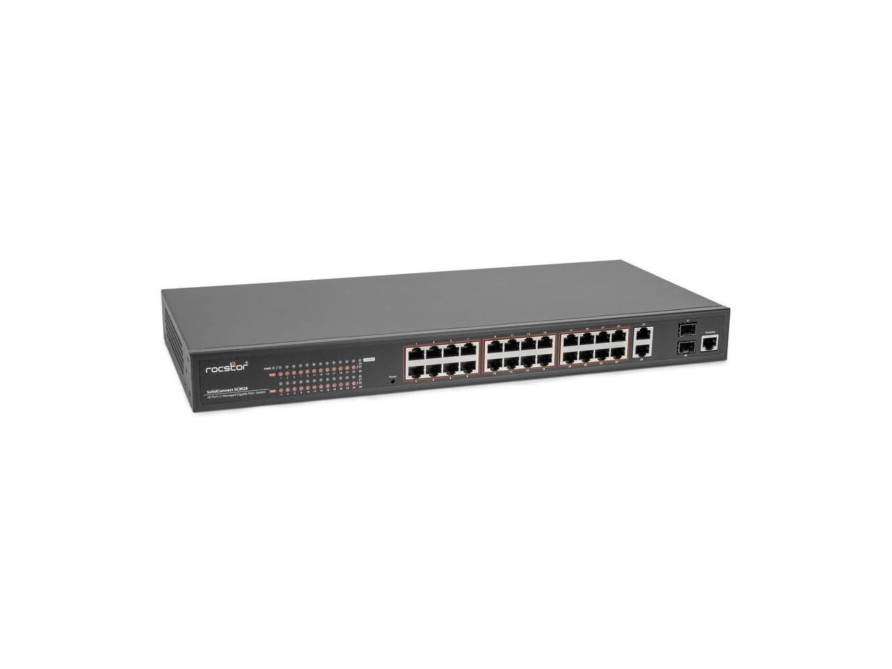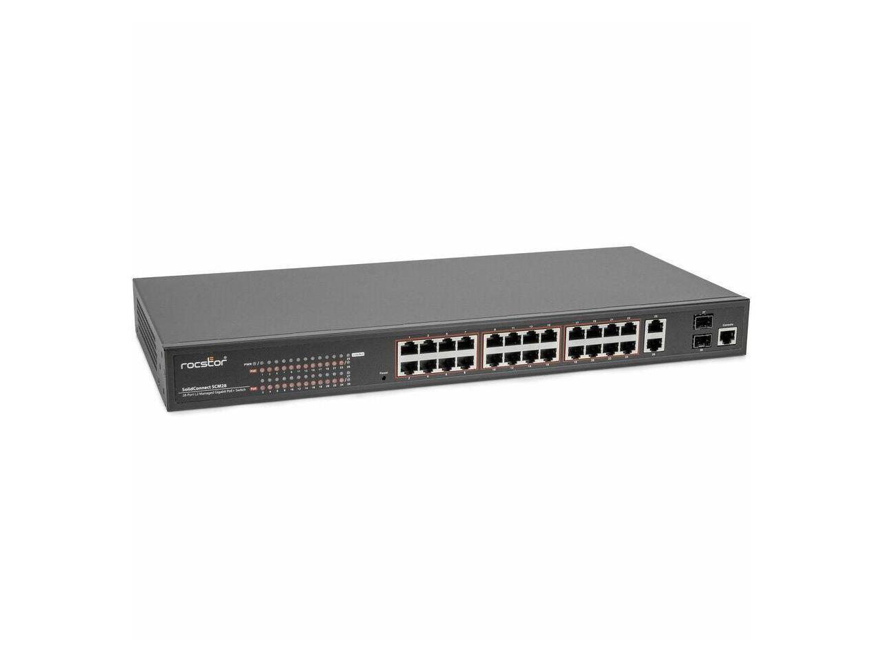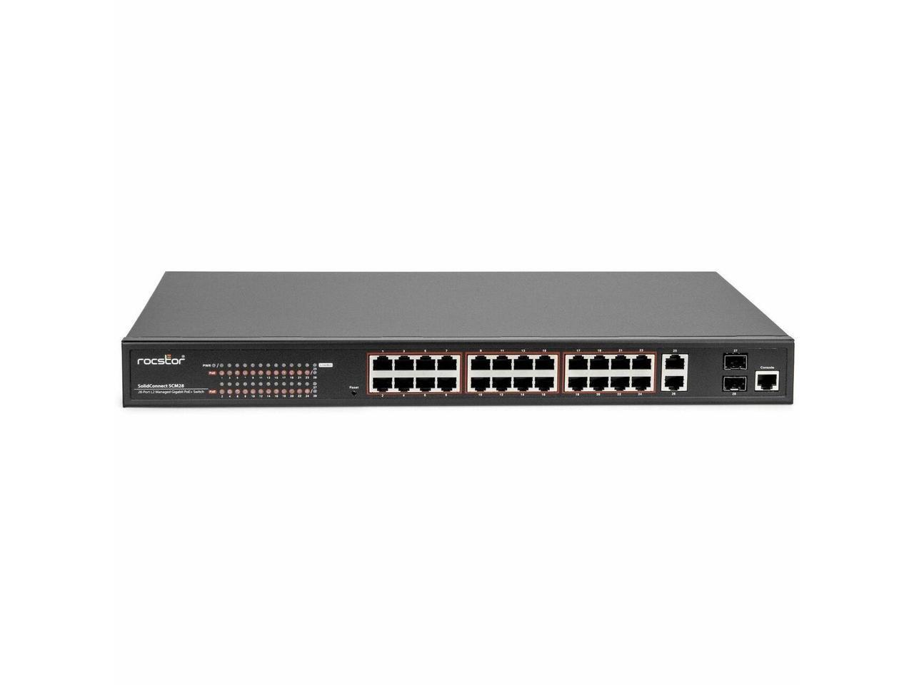 - The Rocstor SolidConnect SCM28 L2 Managed PoE+ Switch boasts 24 versatile Gigabit PoE ports (10M/100M/1000M), coupled with one Gigabit RJ45 and two Gigabit SFP transceiver slots for flexible connections.