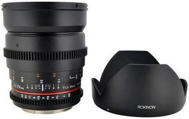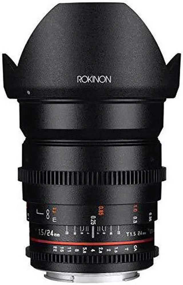 Utilizing a multi-layer coating process for consistent color rendition from lens to lens the Rokinon 24mm T 1.5 VDSLR ED AS IF UMC II Lens answers the challenge of assembling a set of lenses over time. Features industry standard geared focus and iris rings that share common position with other Rokinon VDSLR lenses. To aid focus pullers who have to work both sides of the lens, the aperture and focus scales are marked on both sides of the lens.