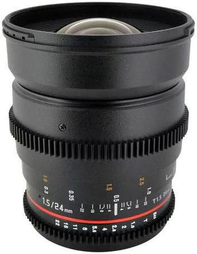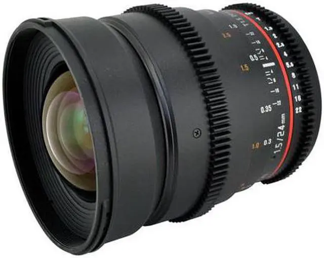 The Rokinon 24mm T 1.5 VDSLR ED AS IF UMC II is a wide angle manual focus cine lens designed for full frame sensor sizes
