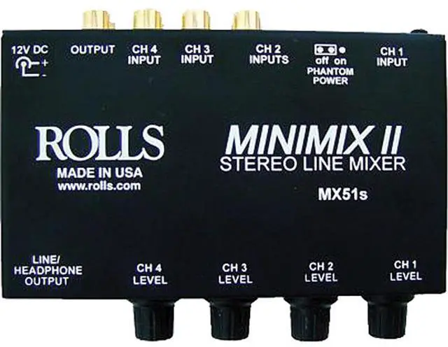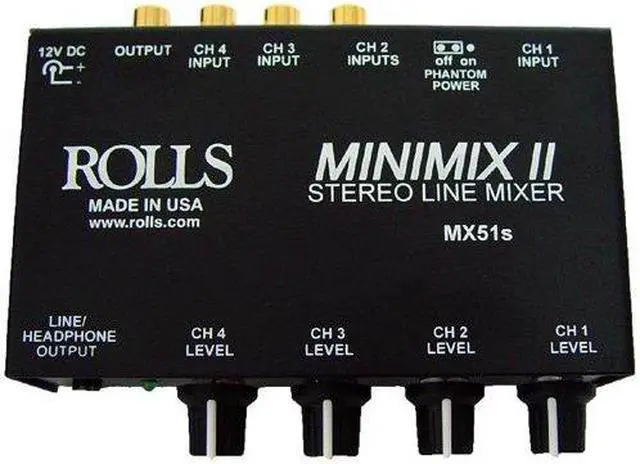 The Rolls MX51s Mini-Mix 2 is small four-channel mixer with individual volume controls and a headphone/line output. The unit has one XLR input along with a 1/8" input and 3 sets of stereo RCA inputs. It has enough gain and output level to connect to a power amplifier, with either RCA or 1/8" jacks. The MX51s is powered by an included Rolls PS27 12 V DC adapter.