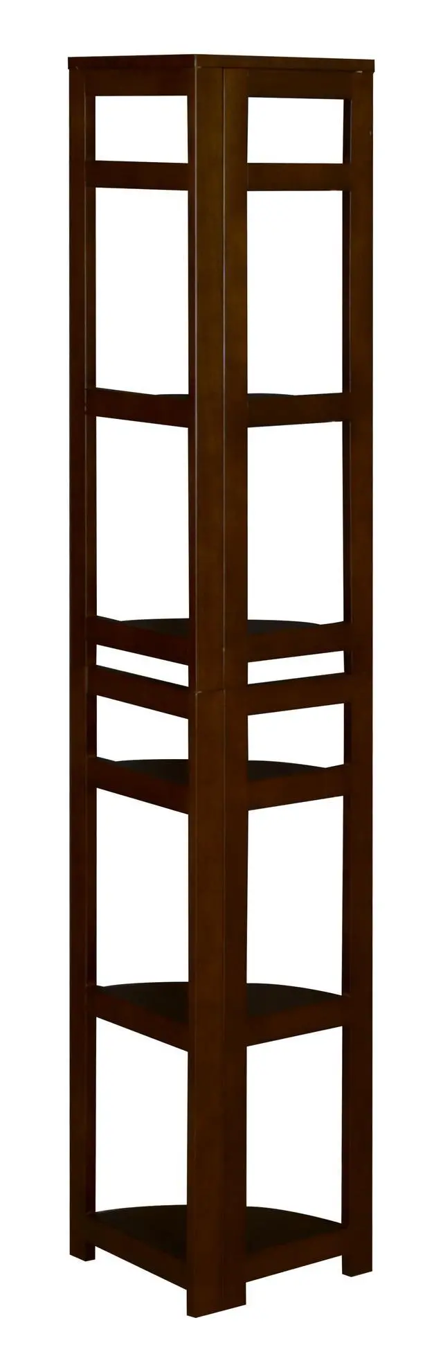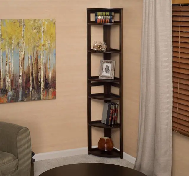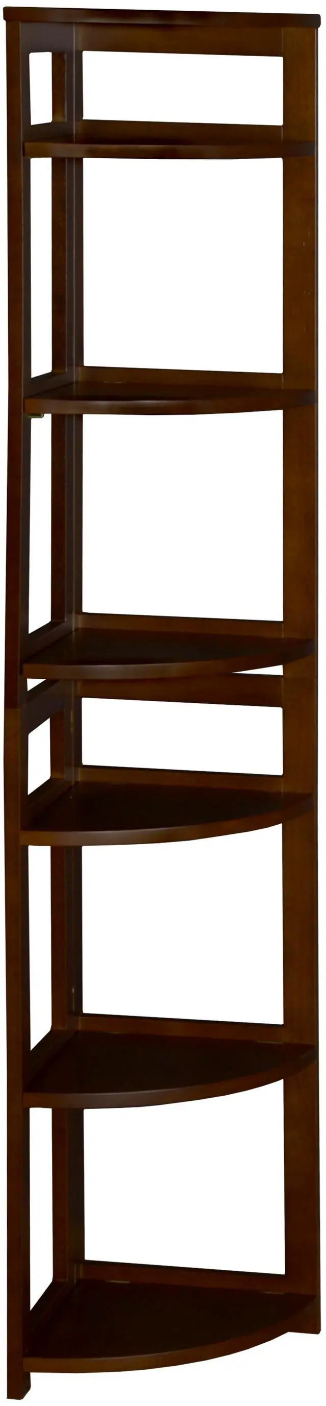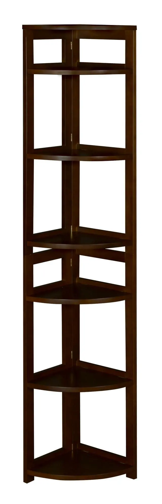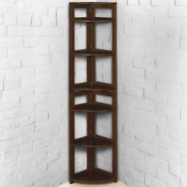 The dorm-room ready Flip Flop collection saves time and money. These folding bookcases unfold into place right out of the box and assemble in less than 5 minutes. This 67" High Corner Bookcase is constructed of a solid hardwood frame and is finished in a deep Mocha Walnut hand-rubbed veneer. Its 6 fixed shelves flip down from storage position and rest securely in place on shelf supports. A top shelf attaches securely without the use of tools and assembly is finished! Perfect for the home and office alike, this bookcase maximizes corner space and folds up for easy transportation and storage when not in use.