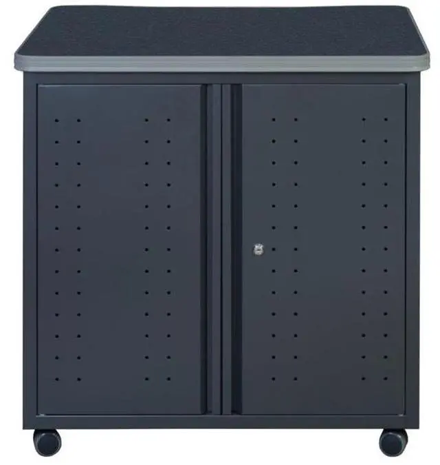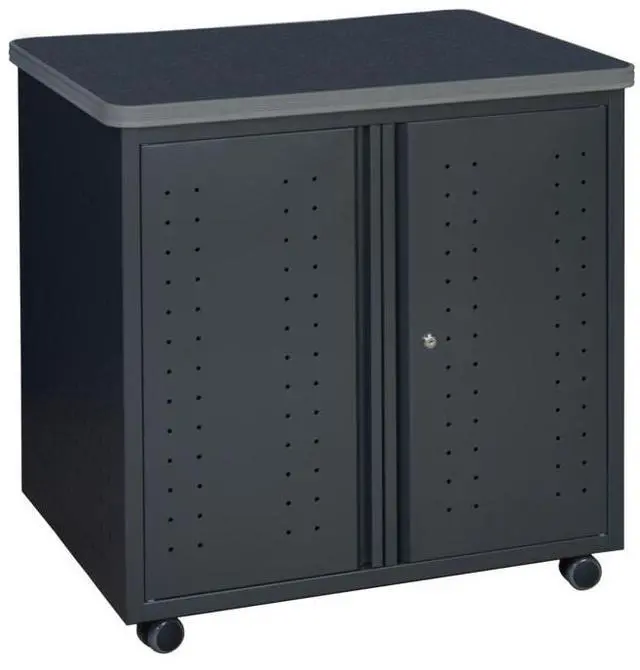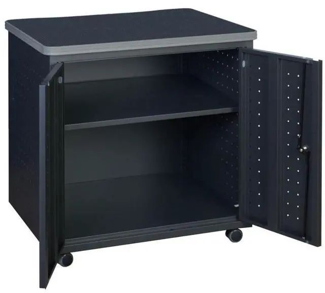 The Romig Mobile Utility and Media Cabinet combines functionality with security, featuring a premium oak top measuring 30" x 24". Constructed from robust 14-gauge steel, this versatile table comes equipped with smooth-rolling casters for effortless mobility throughout your workspace.