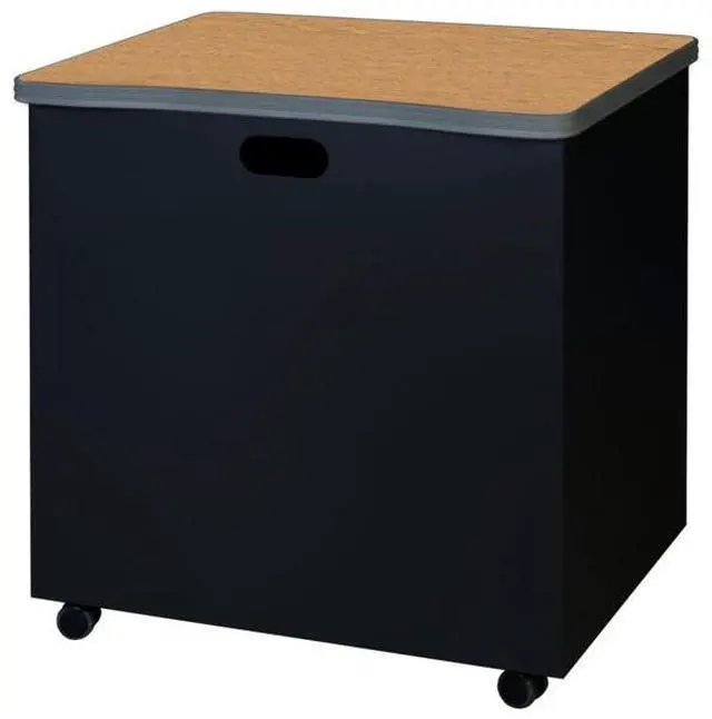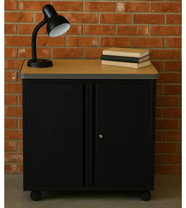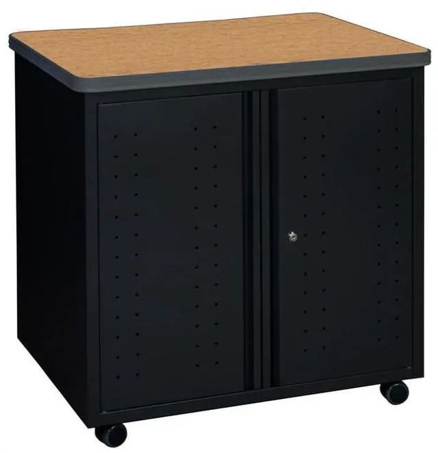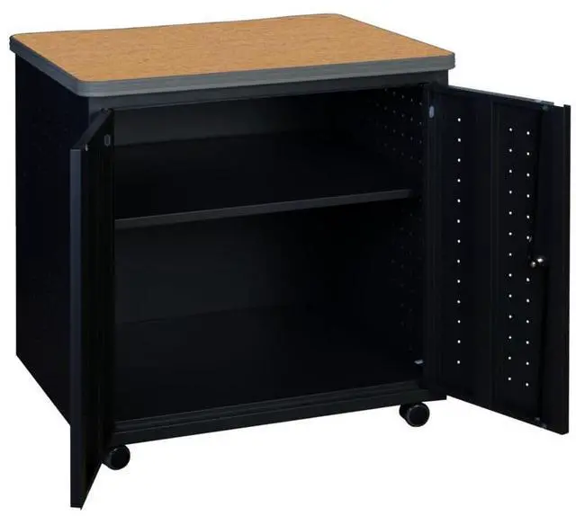 The Romig Mobile Utility and Media Cabinet combines functionality with security, featuring a premium oak top measuring 30" x 24". Constructed from robust 14-gauge steel, this versatile table comes equipped with smooth-rolling casters for effortless mobility throughout your workspace.