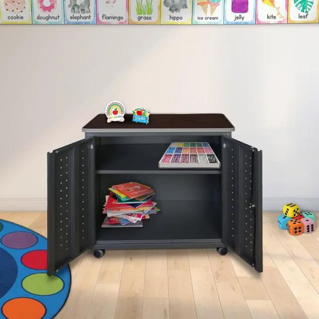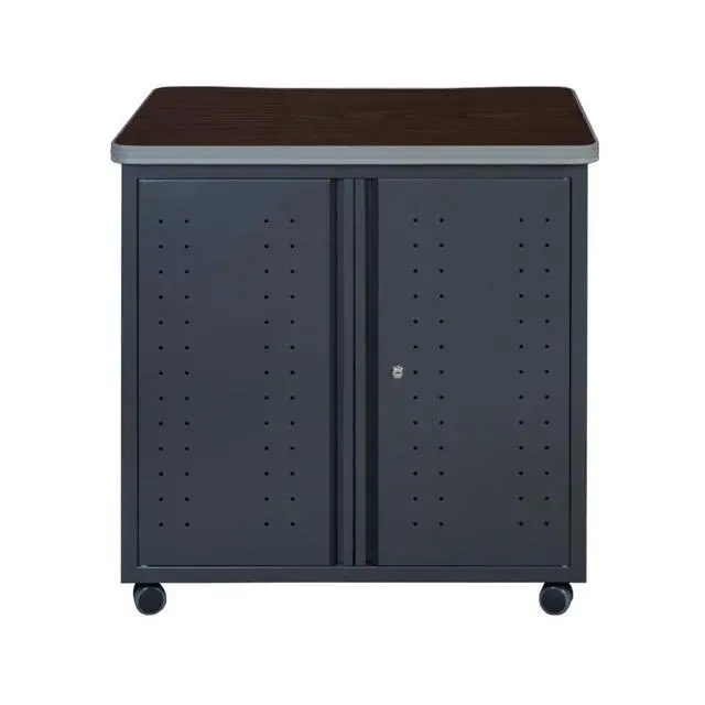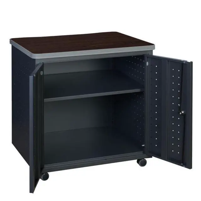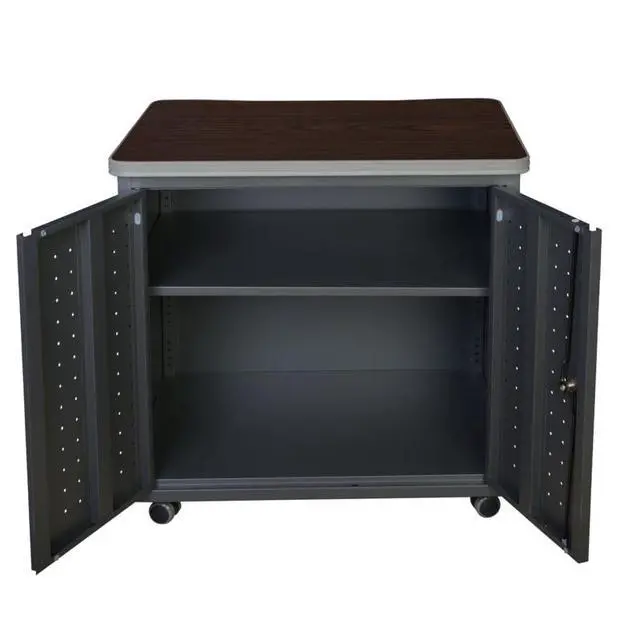The Romig Mobile Utility and Media Cabinet combines functionality with security, featuring a premium oak top measuring 30" x 24". Constructed from robust 14-gauge steel, this versatile table comes equipped with smooth-rolling casters for effortless mobility throughout your workspace.