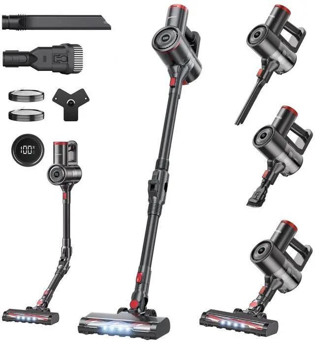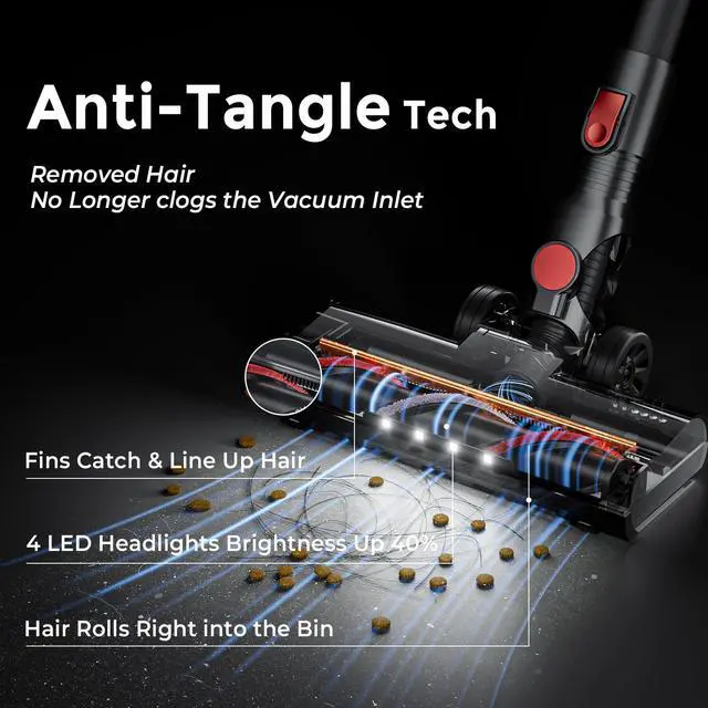40KPA strong suction power / Bendable Wand( cleans without bending) / 45 min long run time / Anti hair tangle design / 1L large capacity dust cup / 2 adjustable suction modes / Multi-functional handheld vacuum cleaner / Flexible light LED floor brush / HEPA Filtration / Washable Filter