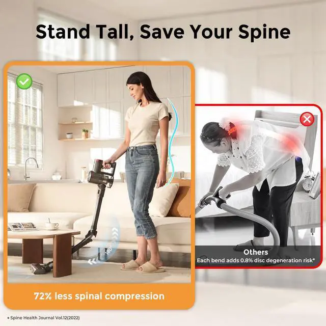 Cleaning without BendingThe 40KPA vacuum cleaner cordless bendable tube reaches 23.3" under furnitures, beds, sofas and low cabines capturing hidden dust and pet hair. Its ergonomic design reduces spinal strain by 72%, protecting your back and knees during whole-home cleaning.