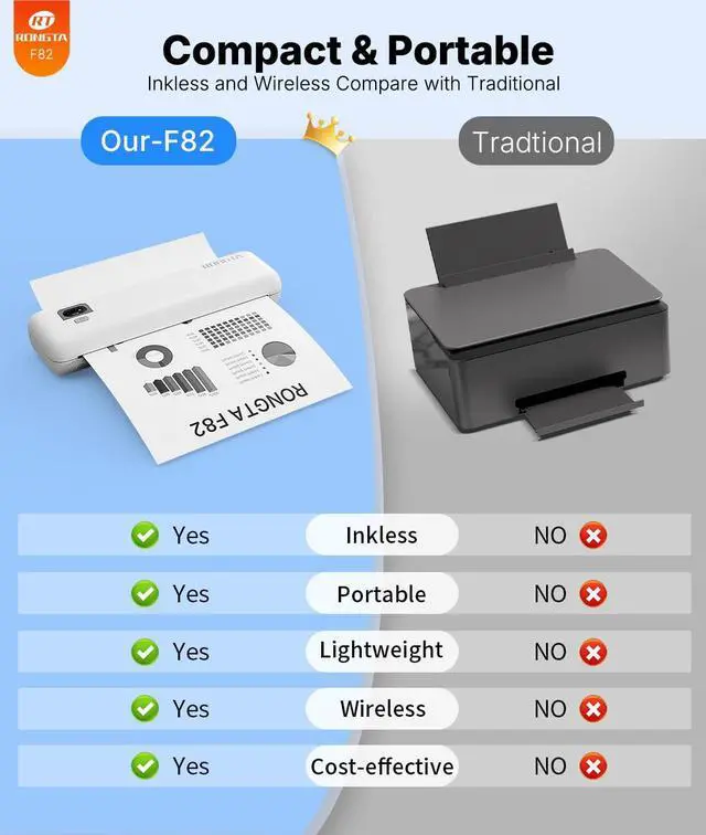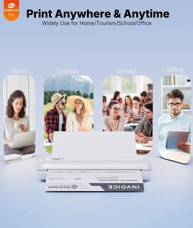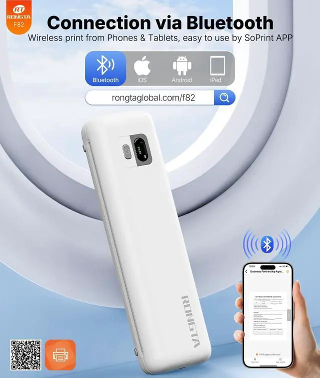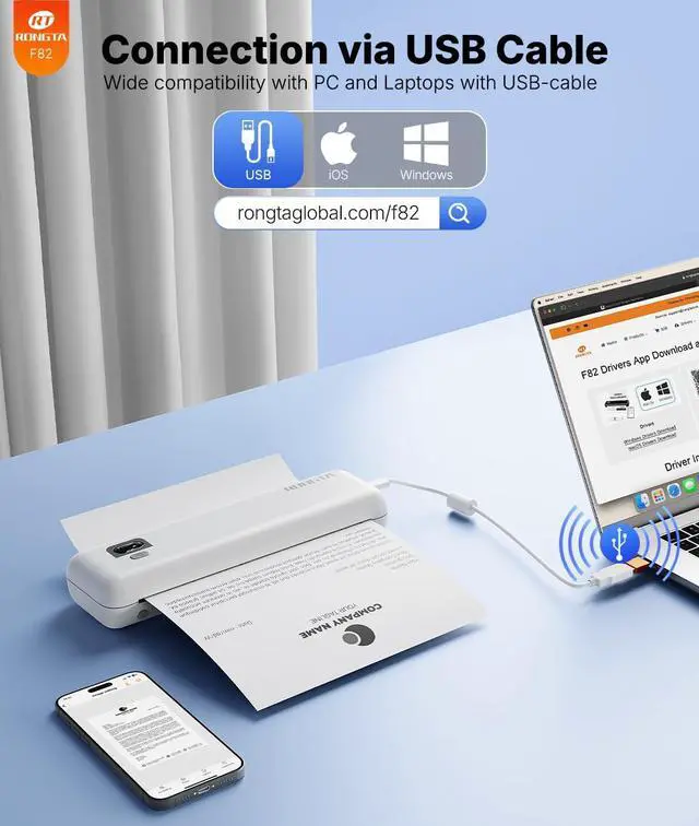 Easy to Set Up: RONGTA F82 portable thermal printer for travel go by bluetooth.Download "SoPrint" APP from Google Play or APP store for iOS and Android Phone or tablet.Connect the printer via bluetooth or via wifi on the App, choose the F82 and make a Bluetooth/Wifi connection in the APP, then it can easily print from your iPhone, iPad, or Android mobile, tablet.The inkless portable printer supports USB cable connection for Laptops,compatible with Windows 7-11 and MacOs for PC.