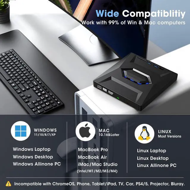 | Incompatible Devices and Discs | This drive is only designed for Windows, Linux, and Mac computers. It can not work with Chrome OS (Chromebook), Ubuntu OS, TVs, cars, trucks, projectors, tablets, iPads, phones, PS4/5, Xbox, Nintendo Switch, and cannot play Blu-ray and 4K discs. |