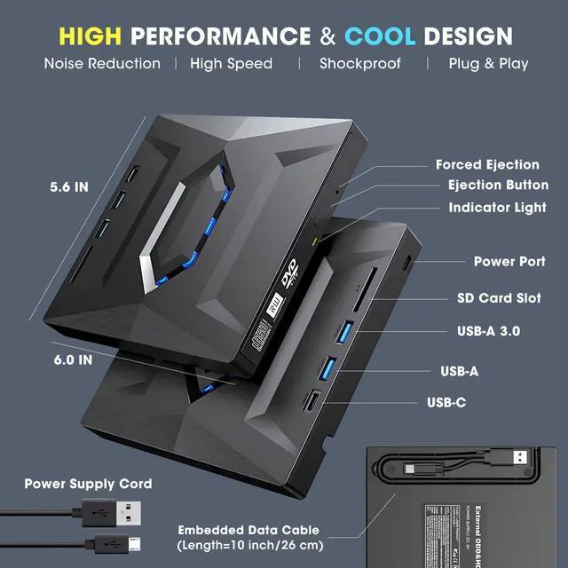 About Data Cable & Power Supply Cord: The USB-A/C data cable is integrated into the bottom of the drive and connects to your computer. If the computer’s USB port does not supply enough power, use the included power cable to connect the drive to a 5V USB charger or power bank to ensure stable operation and prevent read or burn errors.