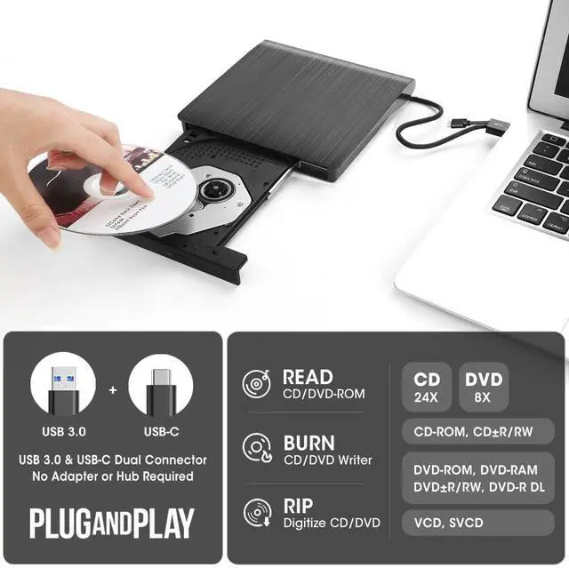 Upgraded USB 3.0 not only supports high-speed transfers up to 5 Gbps — 10 times faster than USB 2.0 — with DVD 8X and CD 24X max read/write, but also offers smooth, stable, and reliable operation with enhanced error correction and noise reduction for long-lasting use.