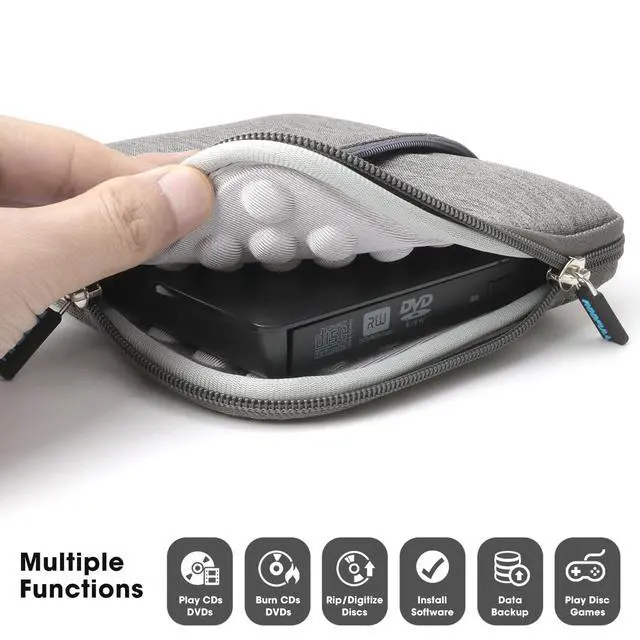 Portable slim external CD/DVD drive with thicker protective carrying case, allows us to carry and use this portable external CD/DVD drive anytime, anywhere no matter you are at home, in the office, or during a trip, no worry about bumps, scratches, drops, and dents accidentally.