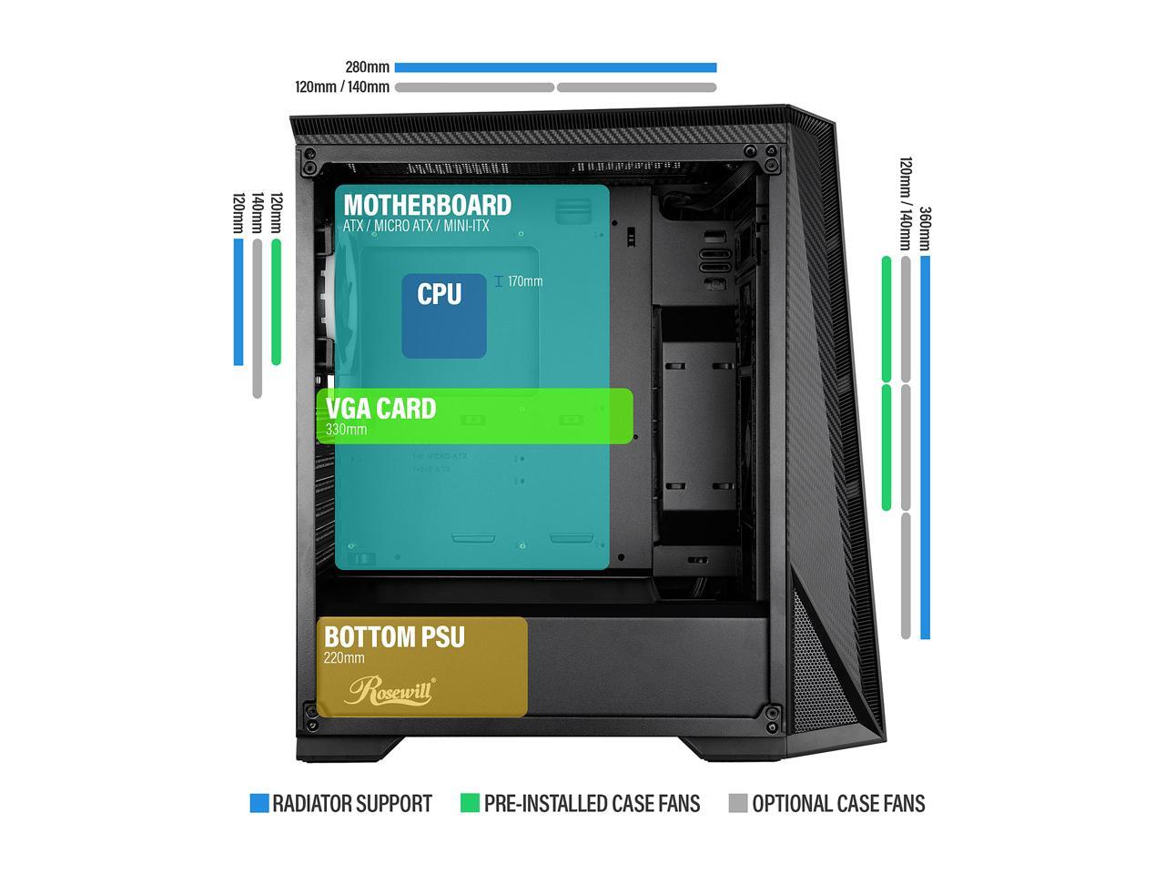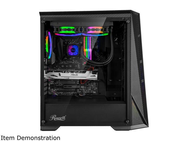 Rosewill ATX Mid Tower Gaming PC Computer Case with RGB Fan & LED Light Strip, 240mm AIO up to 360mm Support, Bottom Mount PSU & HDD/SSD, Tempered Glass & Black Steel - ZIRCON M