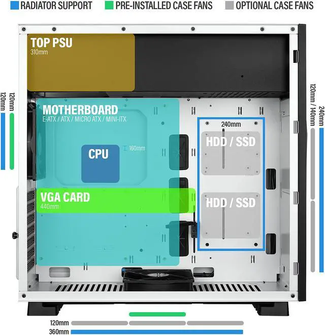 Pre-installed fans draw cool air upwards toward the GPU and motherboard. Plus, the case's removable bottom dust filter permits easy maintenance, making particle buildup the least of your worries.