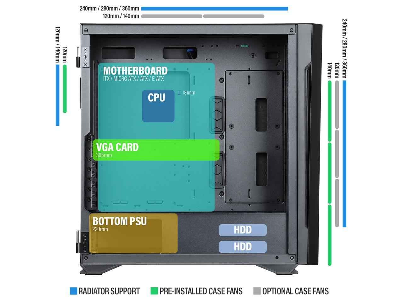 - Ultimate Cooling Solution: PSU shroud capable of mounting two 120mm fans for extreme cooling with optional 360mm liquid cooling radiator on top and front, 240mm radiator on PSU shroud, and 140mm radiator at rear to quench the zealous tower busy executing all your commands.