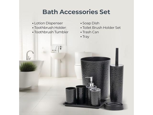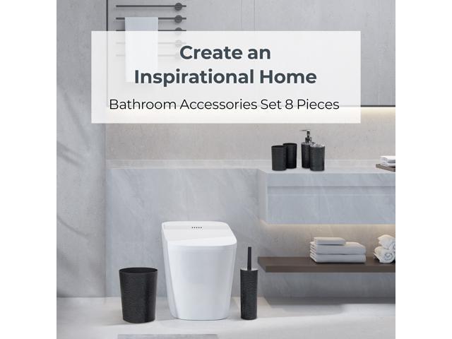 - Complete 8-Piece Bathroom Set: Includes Trash Can, Toilet Brush with Holder, Lotion Dispenser, Toothbrush Holder, 2 Toothbrush Cups, Soap Dish, and Tray - everything you need in one purchase