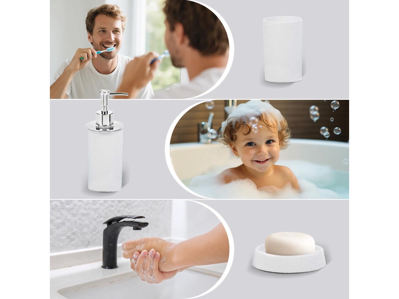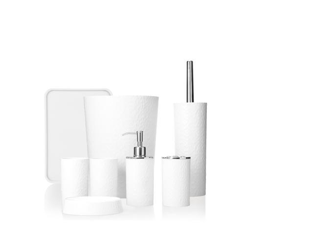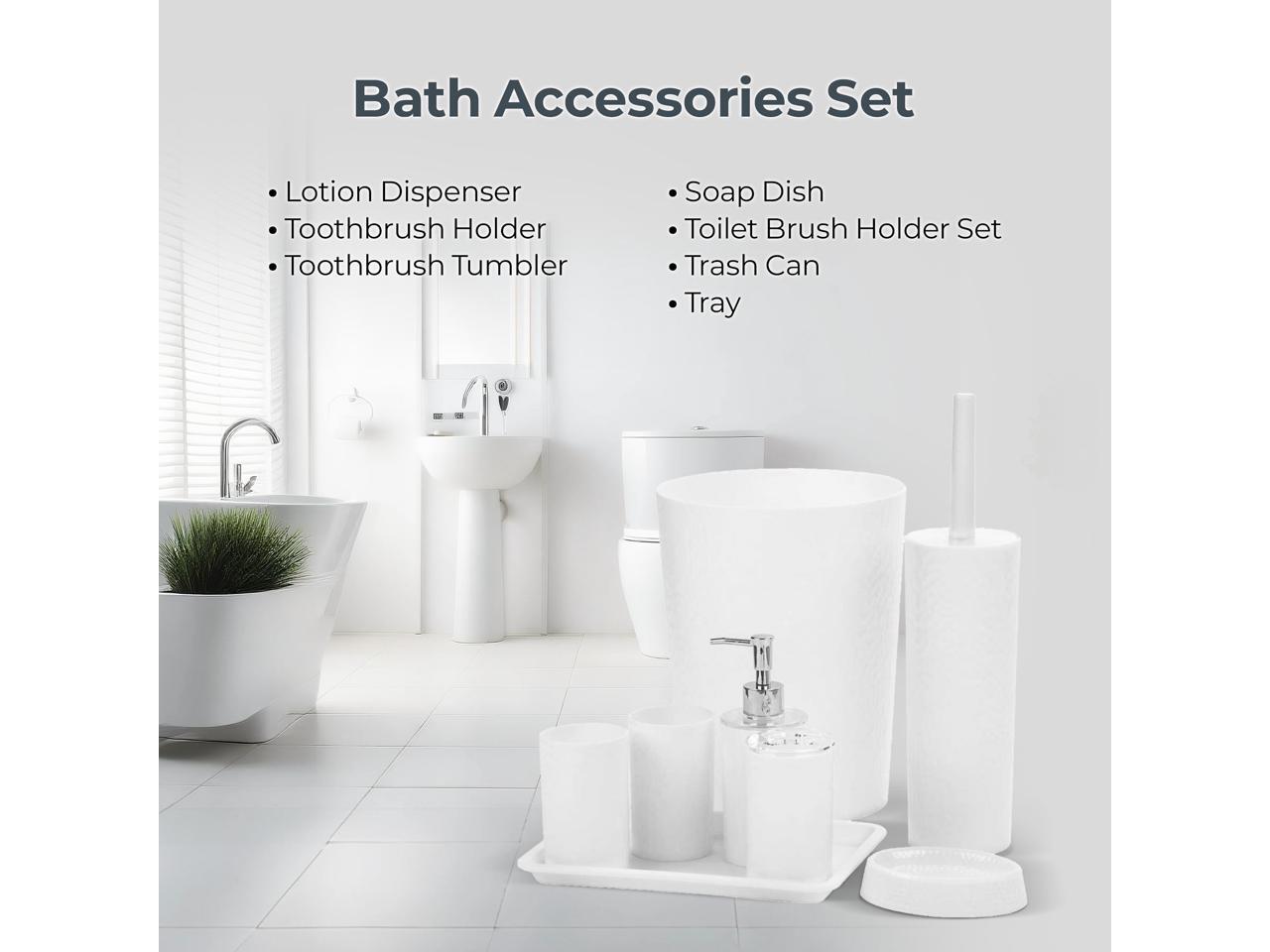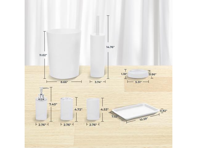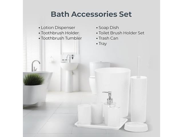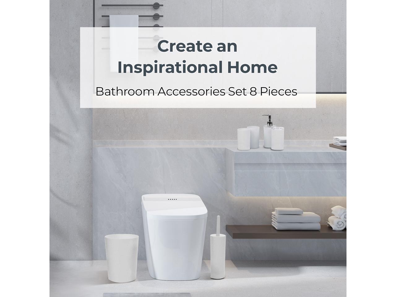 - Complete 8-Piece Bathroom Set: Includes Trash Can, Toilet Brush with Holder, Lotion Dispenser, Toothbrush Holder, 2 Toothbrush Cups, Soap Dish, and Tray - everything you need in one purchase