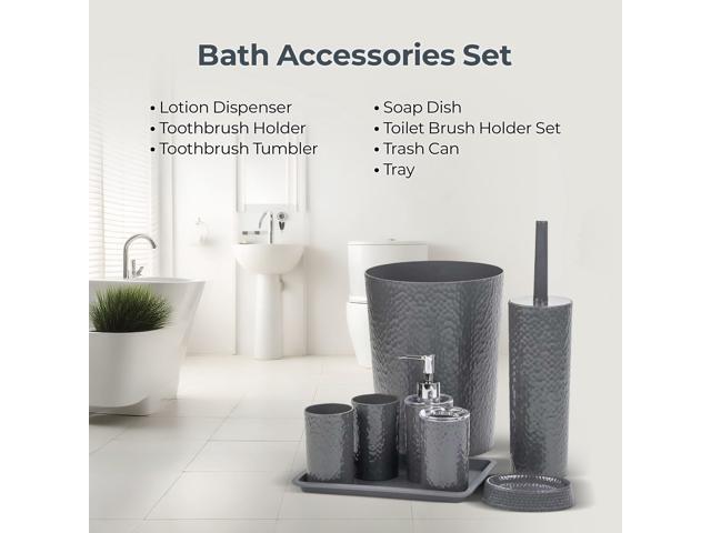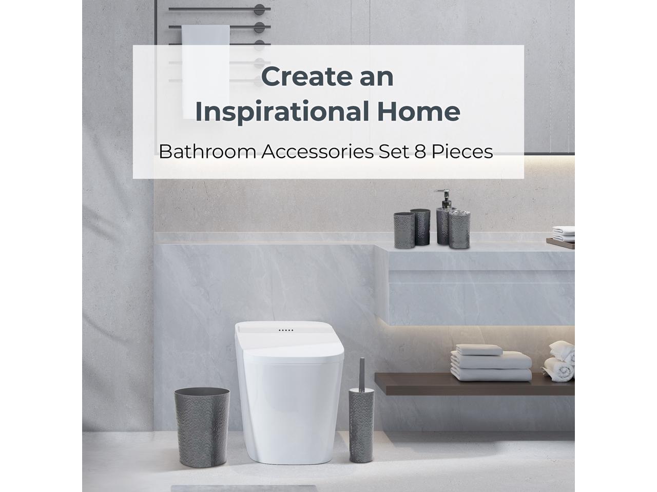 - Complete 8-Piece Bathroom Set: Includes Trash Can, Toilet Brush with Holder, Lotion Dispenser, Toothbrush Holder, 2 Toothbrush Cups, Soap Dish, and Tray - everything you need in one purchase
