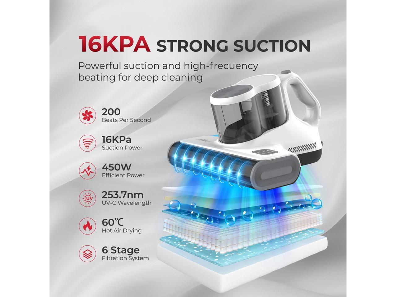 - Efficient Cleaning Performance: Equipped with a 450W motor, 16Kpa suction, 60°C hot air drying, dual dust cup, widened suction port, and a 6-stage filtration system for deep cleaning.
