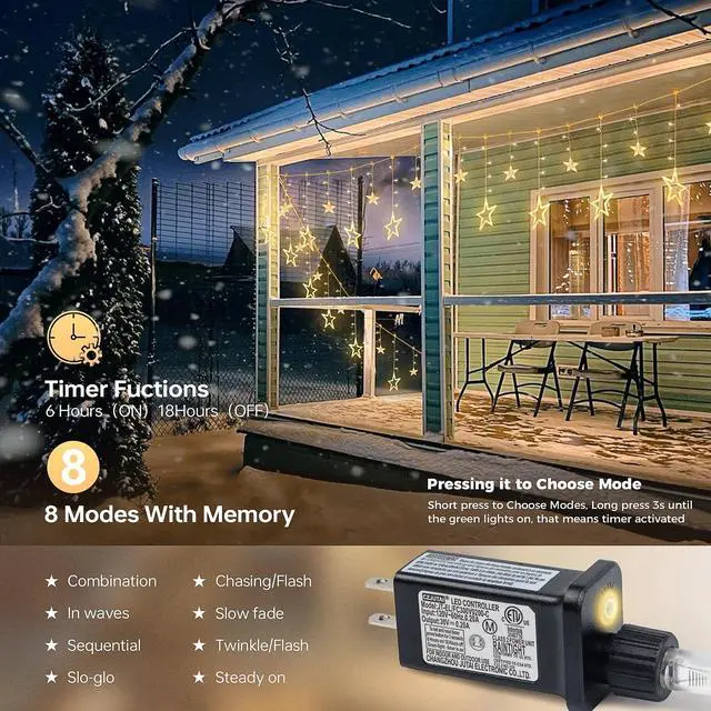 Our warm white star fairy lights have 8 flashing modes,you can press the button to control any mode you like and it can remember the last light setting mode with memory function.