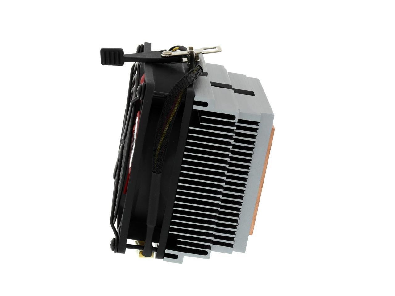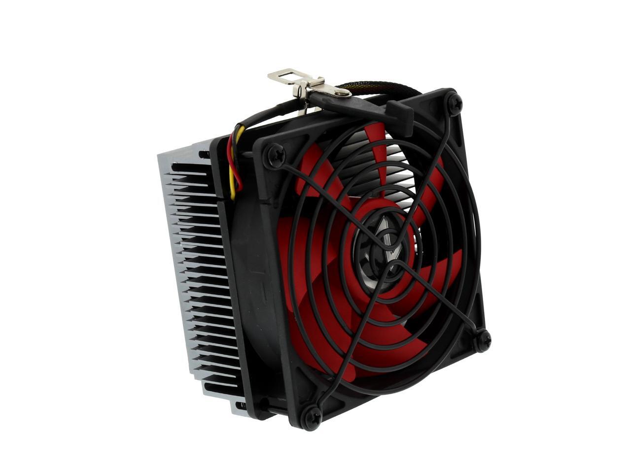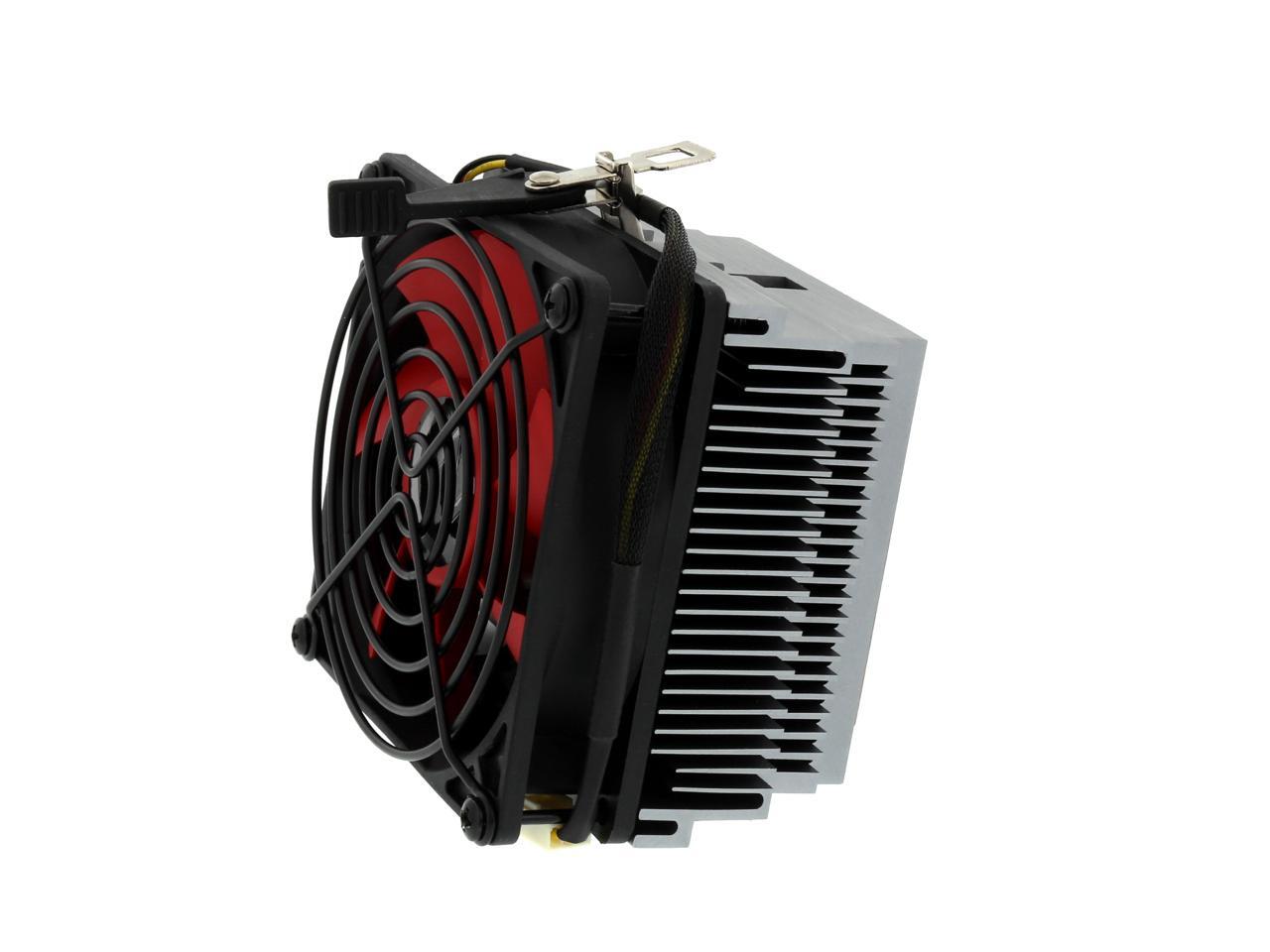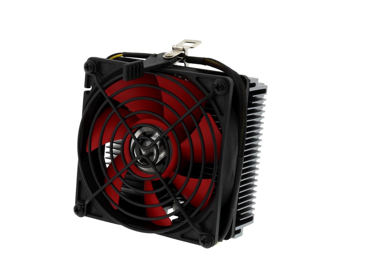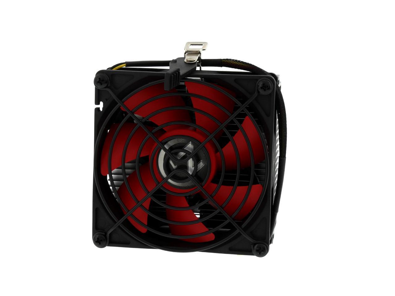 The extruded anodized aluminum cooler has a large dimension copper heat spreader base plate which efficiently transfers heat from the CPU to the tapering convection fins. It is topped with a red 92mm fan which moves up over 57.2 CFM of cooling air at its maximum 3100 RPM speed.