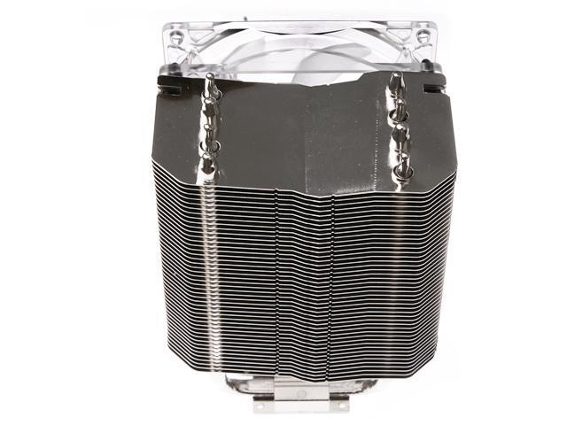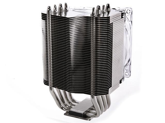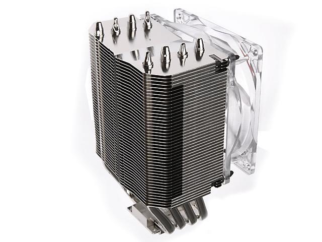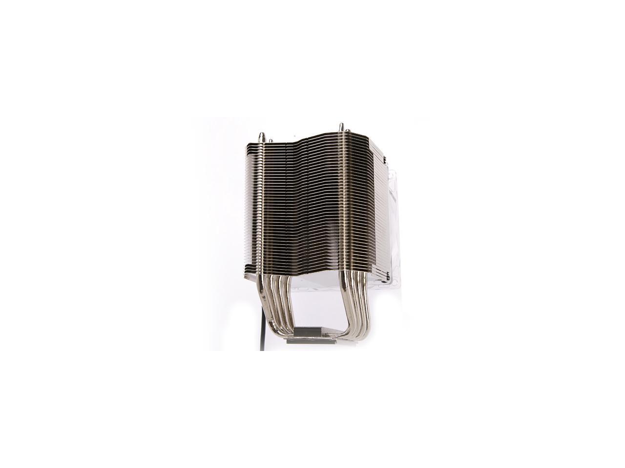 The transparent 92mm 7-bladed fan is attached vertically to the array of hi-grade aluminum fins. It blows an impressive 47 CFM of cooling air at its maximum speed of 2400 RPM. It features PWM functionality to allow the computer to automatically adjust the fan's speed to as low as 800 RPM depending on thermal need which will reduce its already quiet 23 dBA noise signature to even lower levels.