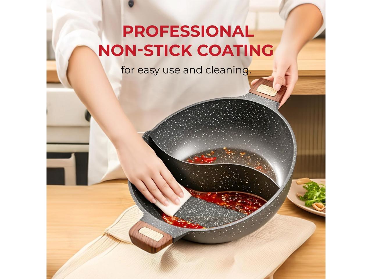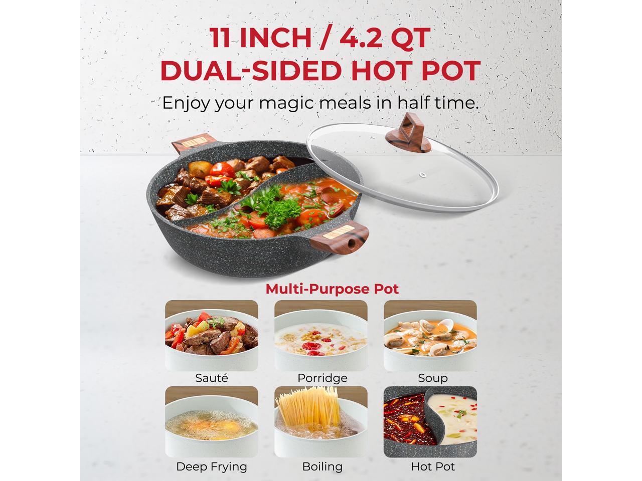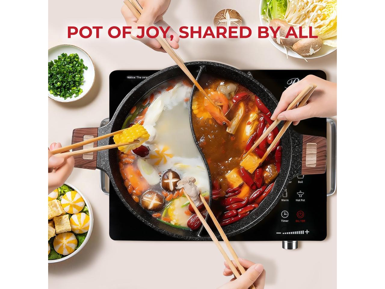- Dual Flavors in One Pot - This 100% PFOA & PFAS-free divided hot pot lets you enjoy both spicy and mild broths simultaneously, catering to different taste preferences in a single meal - perfect for cutting your cooking time in half.