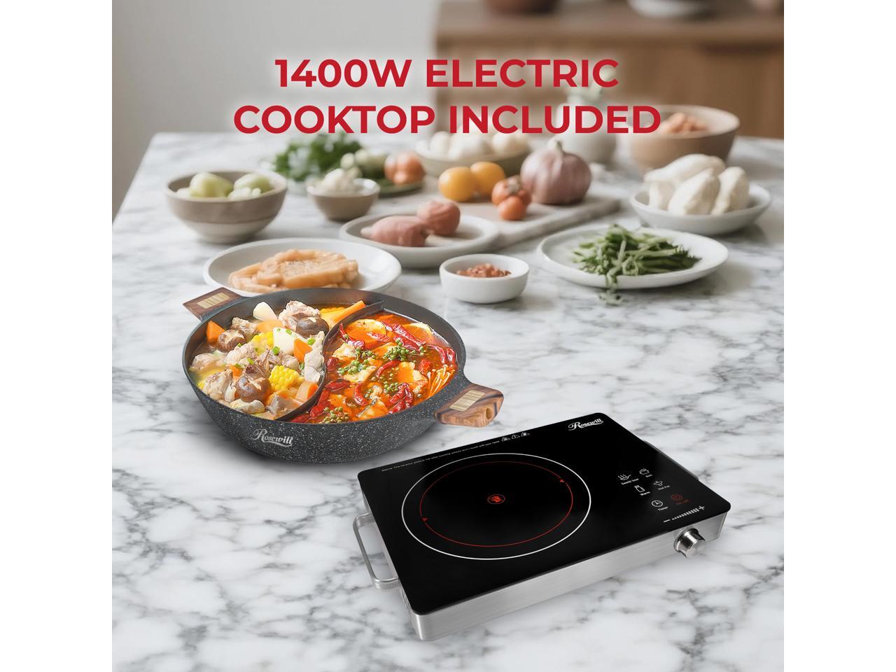 - Useful Accessories Included - The set comes with a Rosewill high-heat cooker along with a silicone soup spoon and spatula. The high-heat cooker is compatible with various pots including glass, cast iron, frying pans, and clay pots - making it versatile for both the dual hot pot and other cooking needs.