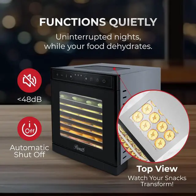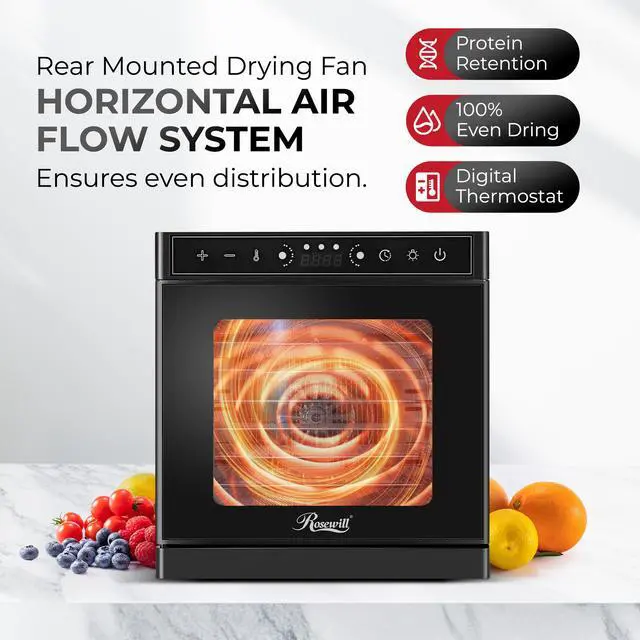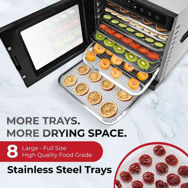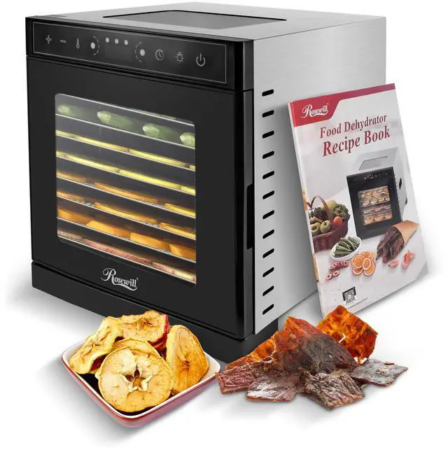 | Feature | Rosewill Large Food Dehydrator, RHFD-25002 Premium Brushed SS Metal Outer Housing Touch Control Panel 8 Layer Metal Trays * 2, Mesh Trays * 1, Fruit Roll Tray Precise Temperature Control 35~90° |