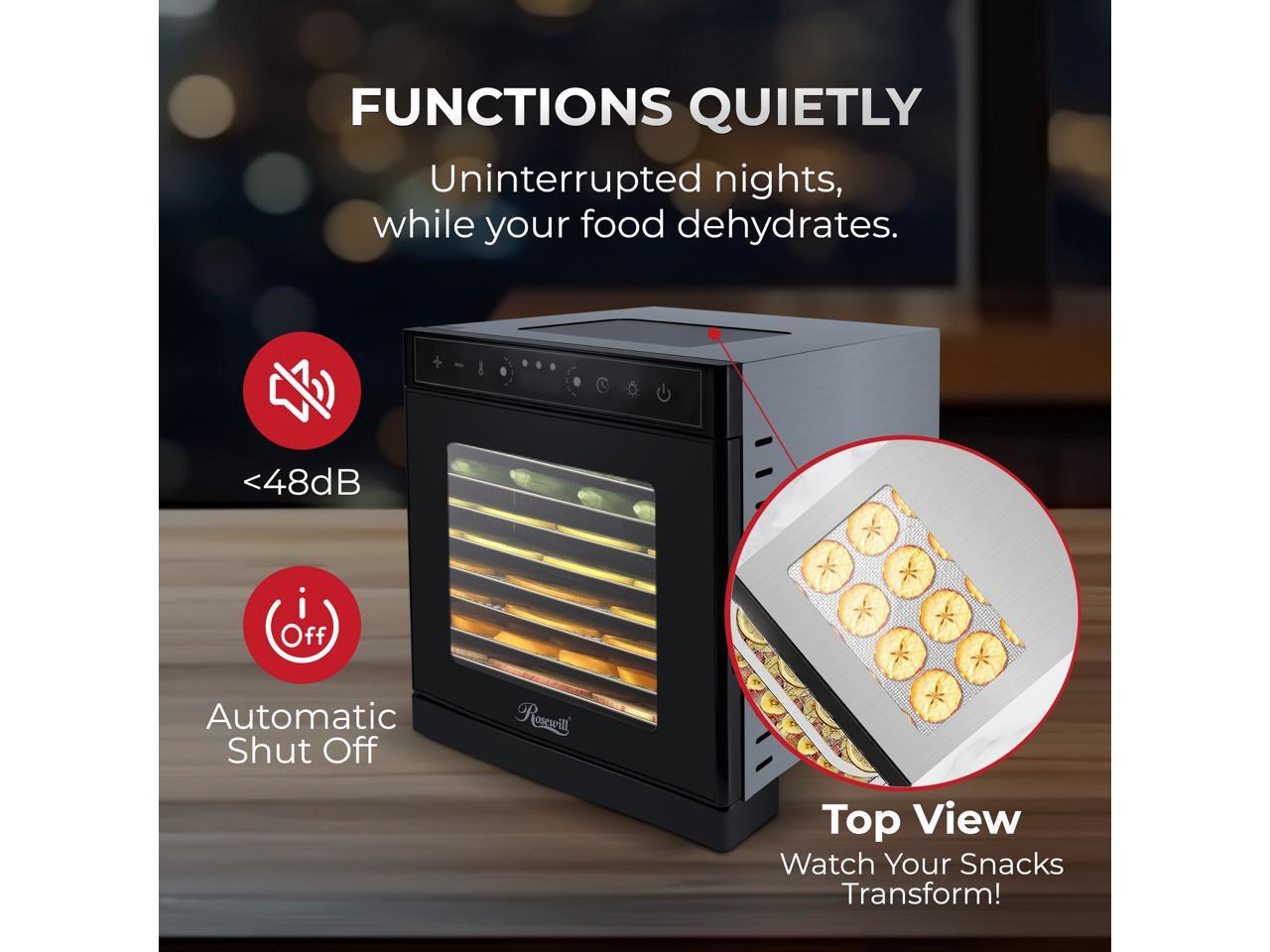 - POWERFUL FOOD DRYING PROCESS - ROSEWILL Food Dehydrator Machine streamlines 400W drying capacity and 360° hot air circulation system that offers an efficient food drying process. It removes excess water from foods without compromising their natural juices, taste, and nutrients – boasting a 97% retention rate of vitamins and minerals.