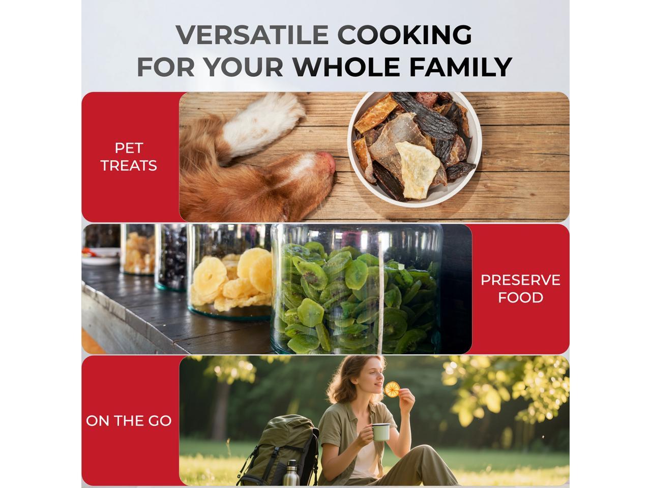 - COMPACT DESIGN & EASY MONITORING: This fruit dryer dehydrator features slim & compact design and built-in easy-grip handle for easy move. Less space is taken on the countertop and watch your snacks transform!