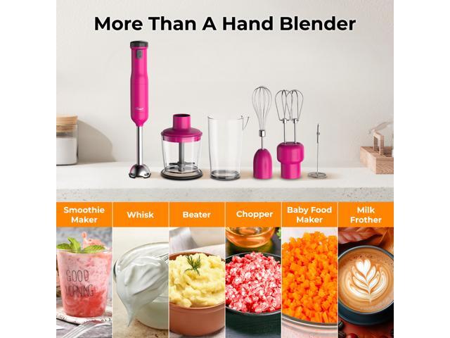 - Comes with stick blender, 700ml beaker, 600ml chopper, whisk, dual beater, and milk frother. Handle everything from soups and nuts to whipped cream and lattes.
